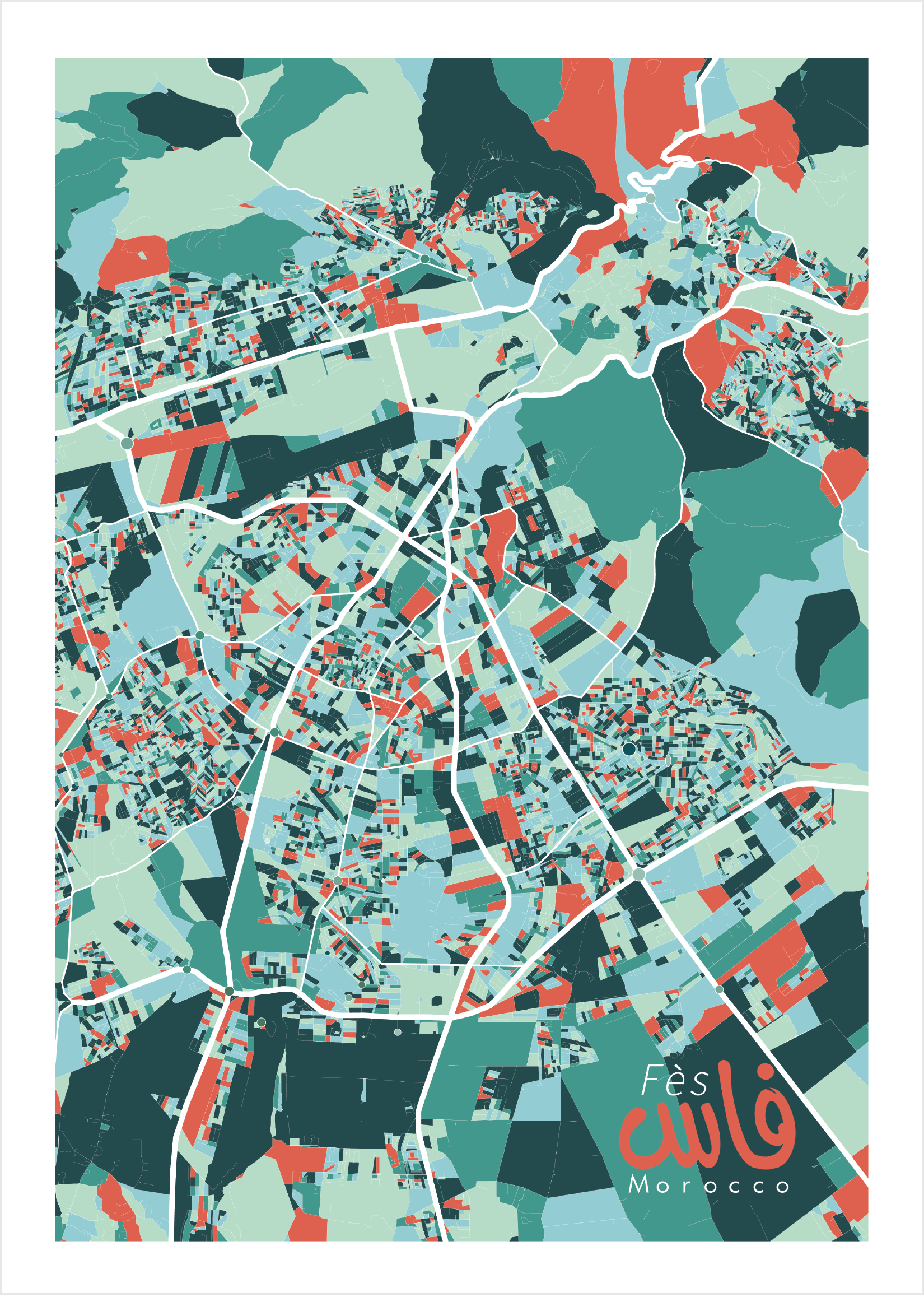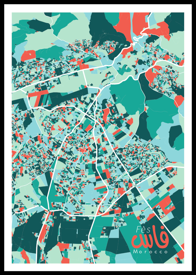 G.M poursuit son exploration graphique autour des plans de villes du Royaume. Cette fois-ci il fait escale à Fès et nous offre un plan haut en couleur aux détails impressionnants. /// G.M Continues his graphic exploration around the city maps of the Kingdom. This time he is stopping over in Fez and offers us a colorful map with impressive details.